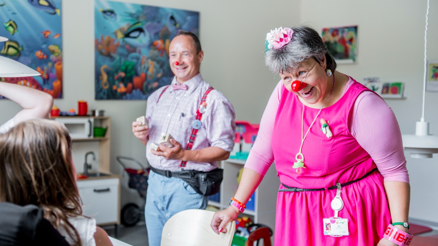 I Afdeling for Børn og Unge er vi så heldige at få besøg af hele to hospitalsklovne, nemlig Tut og Luici. De er begge uddannet hospitalsklovne og er barnlige og impulsive udadtil, men målrettede og professionelle i deres arbejdsmetoder. Med deres smil, latter og tid til leg spreder de glæde hos både børn, forældre og personale.